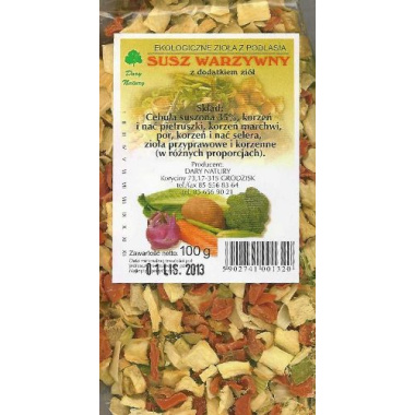 Skład: Cebula suszona, korzeń i nać pietruszki, korzeń marchwi, por, korzeń i nać selera, zioła przyprawowe i korzenne.